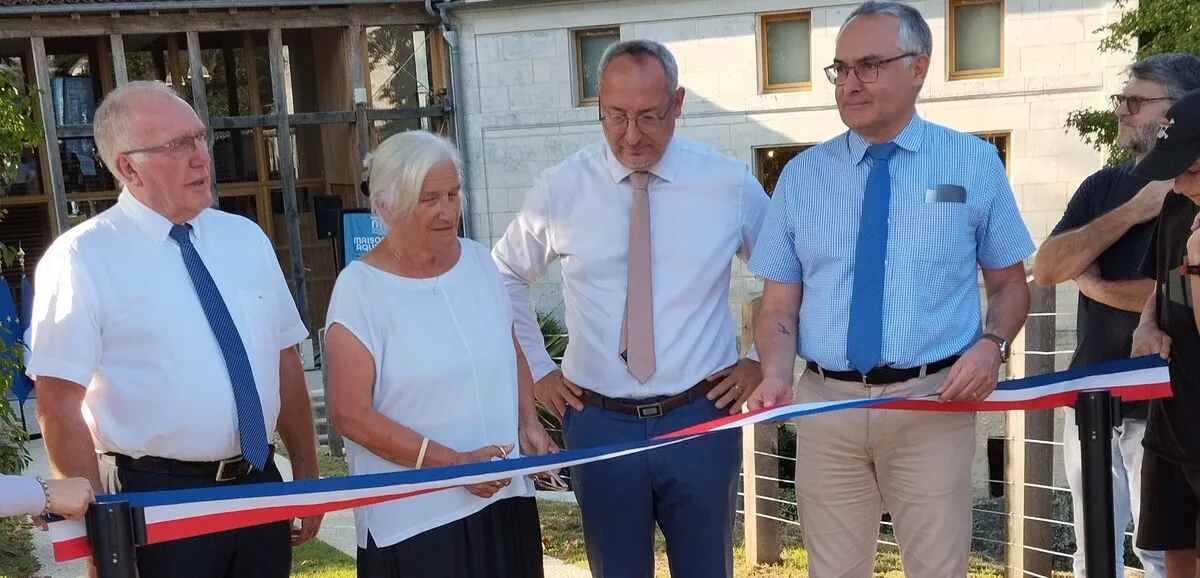 De gauche à droite : Francis Grellier, Maire de Fontcouverte et conseiller communautaire, Françoise Libourel, Maire de Vénérand, Bruno Drapron Maire de Saintes et Président de l’Agglomération, Guillaume Braud sous-préfet de Saintes. Photo : Haute Saintonge.