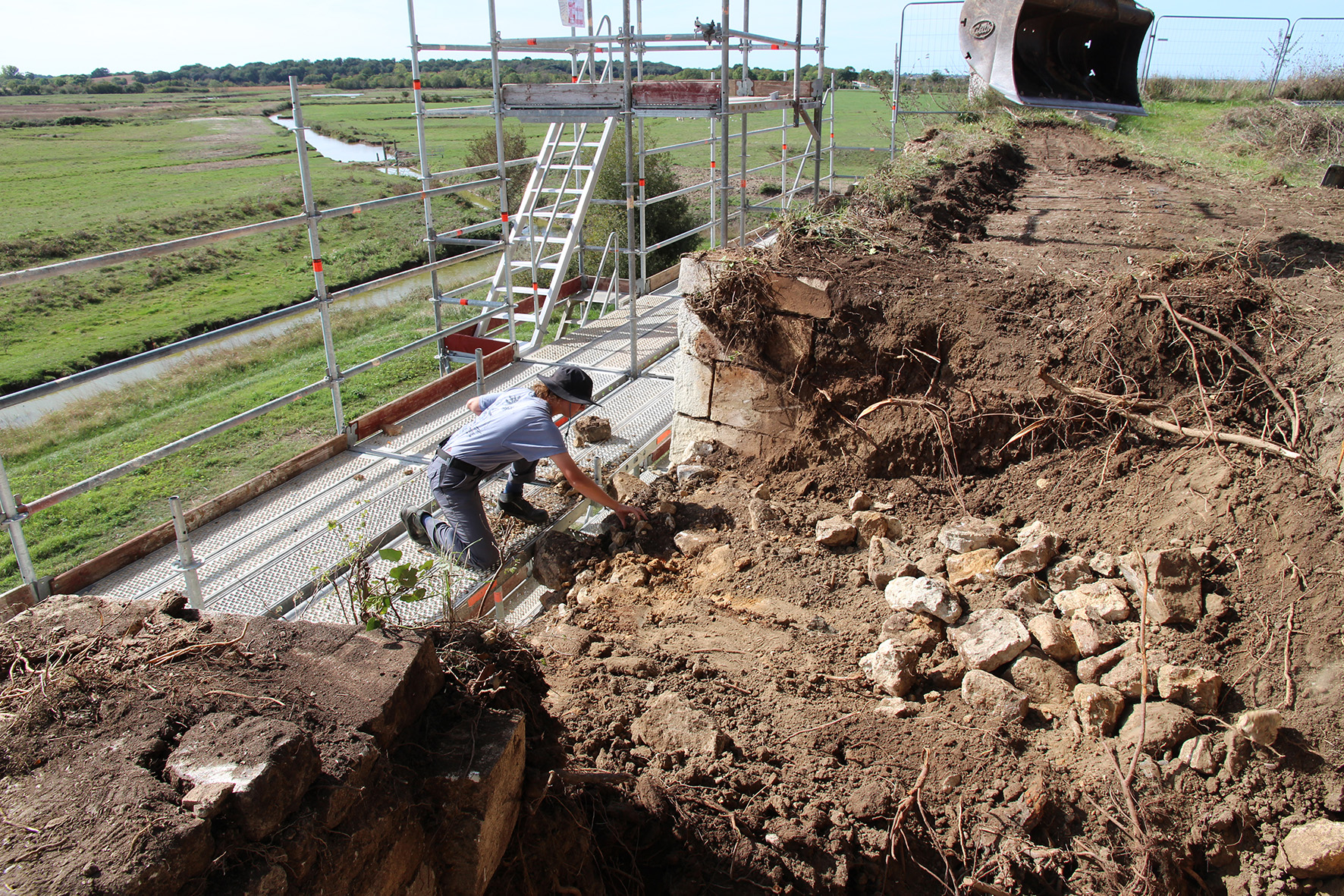 Les premières investigations ont été réalisées en 2023 au travers de tranchées de diagnostic à la pelle mécanique réparties à l’intérieur du corps de la place et sur le terre-plein du rempart. Ces travaux à l’intérieur du bastion d’Hiers ont permis de mettre au jour les niveaux correspondant à la période d’érection du bastion vers 1630 par Pierre d’Argencourt. En 2025, la courtine et le bastion de la mer ont fait l’objet ont fait l’objet de la seconde opération d’archéologie préventive, qui est toujours en cours actuellement. Les résultats des premiers sondages font état d’une antériorité du logis du Gouverneur de Brouage par rapport au rempart construit au XVIIe siècle. Les deux opérations archéologiques ont donc permis de mettre en évidence plusieurs phases de construction et de reconstruction; ces premiers résultats demanderont à être complétés par d’autres investigations sur les autres bastions et courtines de Brouage.