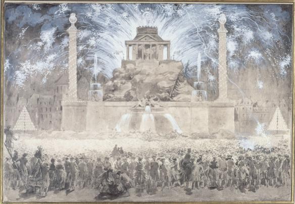 Image : tableau du  » Feu d’artifice tiré de l’hôtel de ville pour la naissance du Dauphin ( 1782) » attribué à Louis Nicolas van Blalenberghe – Musée Carnavalet, Paris.