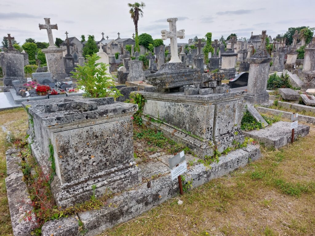 Cet article présente les résultats des recherches historiques et généalogiques menées en 2025 par le groupe de bénévoles de la Société d’archéologie et d’Histoire de la Charente-Maritime (SahCM). Ce travail s’inscrit dans un projet de sauvegarde et de transmission de la mémoire des personnalités et des familles qui ont marqué l’histoire de la ville de Saintes, tout en mettant en lumière l’intérêt patrimonial et artistique de certaines sépultures.