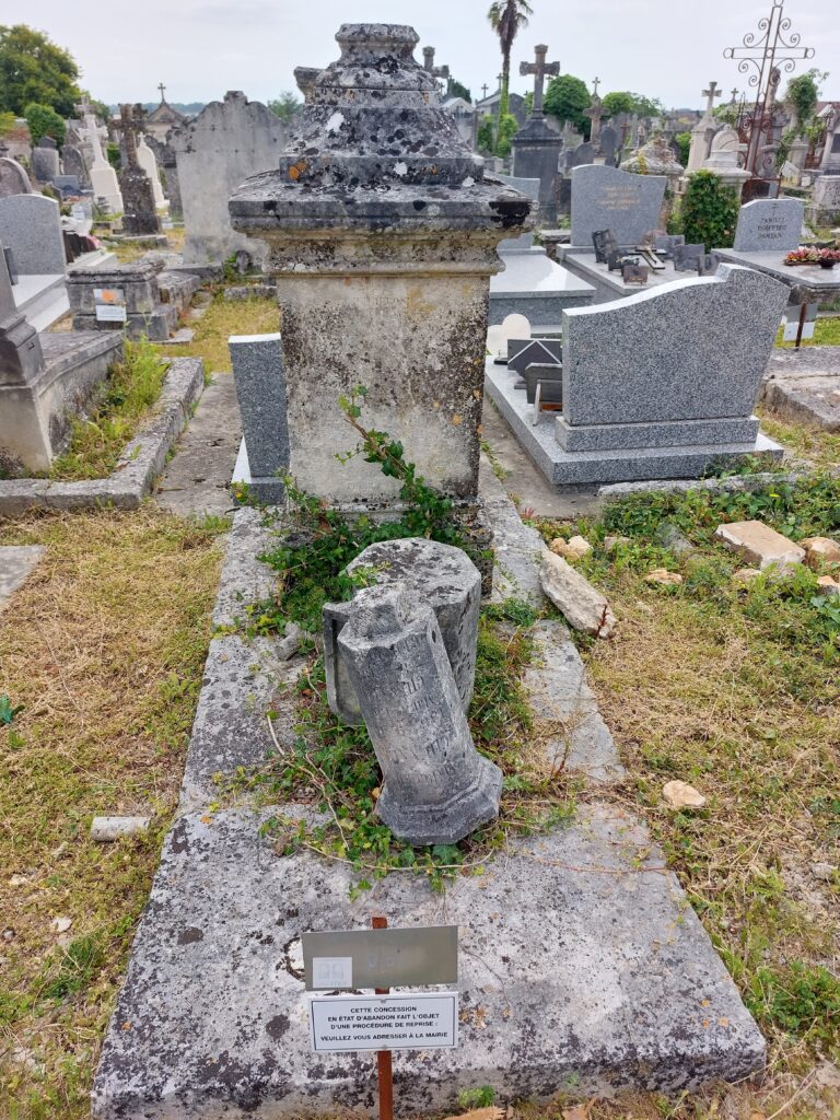Le cimetière de Saint-Vivien a compté jusqu’en septembre 2025 la sépulture du premier fils de ce survivant : Jean Baptiste Henri Melchior Griffon du Bellay (1819-1886) né trois ans après le naufrage. Au retour du périple qui devait emmener les 400 passagers au Sénégal, Alexandre Griffon du Belay se marie avec Claire de Nesmond (1788-1859), née sur l’île de la Martinique. De ce mariage, naît en premier Melchior Griffon du Belay à Rochefort. Ce dernier habite à Saint-Denis-du-Pin certainement après son mariage en 1844 avec Louise Scolastique Verneuil (1817-1887) native de ce village. Il est employé aux douanes, puis inspecteur et receveur des douanes jusqu’à sa retraite. Avec Louise, ils ont quatre enfants, dont deux seulement dépassent la majorité. Armand (1846-1882) suit les pas de son père en étant commis à la direction des douanes. Il est emporté par la fièvre typhoïde quelques années après son mariage. Quant à sa sœur Sidonie (1848-1922), elle devient religieuse au couvent de la Providence à Saintes. Après avoir demeuré un temps à Taillebourg, Melchior Griffon du Belay vient vivre à Saintes en 1883 mais meurt d’une « longue et douloureuse maladie » (Echo Rochelais 30/06/1883), il s’éteint deux mois plus tard à l’hospice civile de Saintes. Sa femme meurt également à Saintes, dans sa maison située esplanade du capitole. Tous les deux inhumés dans cette sépulture.