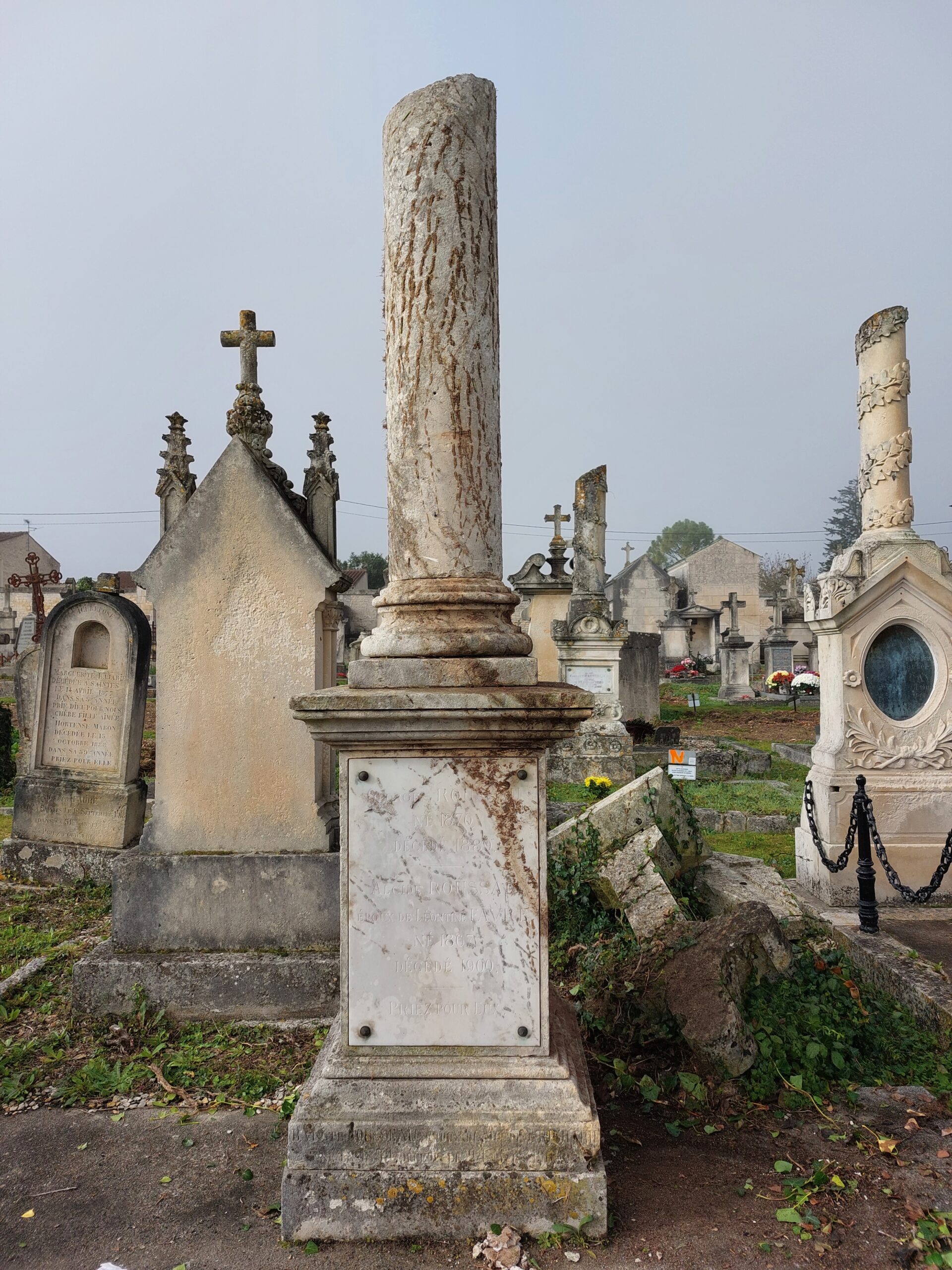 La sépulture a sans doute été achetée par Jean-Baptiste Rousseau vers 1889, lors de la perte de son fils cadet, Georges Jules Rousseau (1870-1889). Originaires des Rabannières, Jean-Baptiste Rousseau (1833-1904) et Justine Marguerite Richard (1844-1922) se marient en 1865 et partent vivre un peu plus au nord, au Terrier des Mouches. Deux ans plus tard nait Léon Alcide Rousseau (1867-1900). Il devient cultivateur comme son père. L’année de ses 20 ans, il s’engage volontairement pour 5 années à la mairie de Rochefort et rejoint les équipages de la flotte. Il fait le voyage de Saintes à Rochefort le 15 février 1888 et commence à apprendre le métier de marin. Dès juin 1888, il débute ses services à la mer en tant que canonnier auxiliaire sur le navire Bretagne, un vaisseau école en station à Brest. Il se spécialise au poste de canonnier auxiliaire sur le vaisseau école La Couronne jusqu’en juin 1889 où il obtient son brevet de canonnier. Basé à Toulon, le vaisseau effectue des entrainements de tirs autour des îles d’Hyères. Le croiseur Le Sané étant de retour à Rochefort après une guerre menée au royaume du Dahomey sur les côtes de l’actuel Bénin, Léon Alcide Rousseau monte à bord quelques jours en septembre 1890 pour participer aux essais, avant que le navire ne reparte dans l’Atlantique sud. Un autre croiseur de 3e classe en acier est mis à l’eau à Bordeaux en août 1889 et Léon Alcide participera également aux essais à Rochefort pendant près d’un an, jusqu’en 1891. Après quelques périodes d’exercices, il passe dans l’armée de terre en 1898, affecté dans l’artillerie à pied à Bayonne puis à Royan. Il se marie en 1897 avec Léontine Favre à Pont-l’Abbé-d’Arnoult où il s’éteindra trois ans plus tard en 1900, à l’âge de 32 ans, sans descendance.