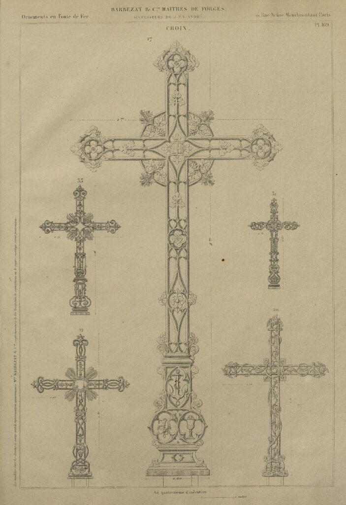 Plusieurs catalogues sont publiés et vendus pour 30 francs par l’établissement Barbezat et Cie. Celui publié en 1860 compte plus de 2600 modèles de moulures, allant des candélabres, des bancs, des cheminées, des fontaines aux statues, aussi bien profanes que religieux. Sur la planche n°169 de ce catalogue, sous le n°31 est dessiné la croix qui ornait jusqu’en septembre 2025 la sépulture de la famille Train-Gautron. La fonderie créait sans cesse de nouveaux modèles et faisait appel à des artistes sculpteurs tels que Mathurin Moreau, Albert Ernest Carrier-Belleuse ou James Pradier. Aujourd’hui encore, nous pouvons admirer ces œuvres qui se sont installées dans notre quotidien (prenons les exemples des fontaines Wallace, des entrées de métro Guimard à Paris, ou encore le monument aux Girondins à Bordeaux) et qui entrent dans les collections des musées.