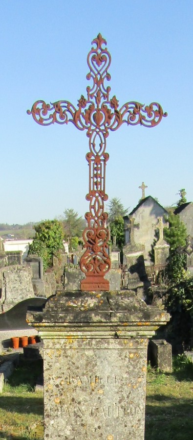 Au détour des nombreuses croix qui ornent les sépultures, l’une d’entre elles a attiré notre attention. Bien que la rouille ait marqué le temps passé, l’état de conservation, la finesse et les détails géométriques de la croix haute de 83 centimètres montée sur un quadrilatère pyramidal, nous ont aussi surpris que l’inscription située à la base de la croix en fer rouge : Barbezat et Cie.