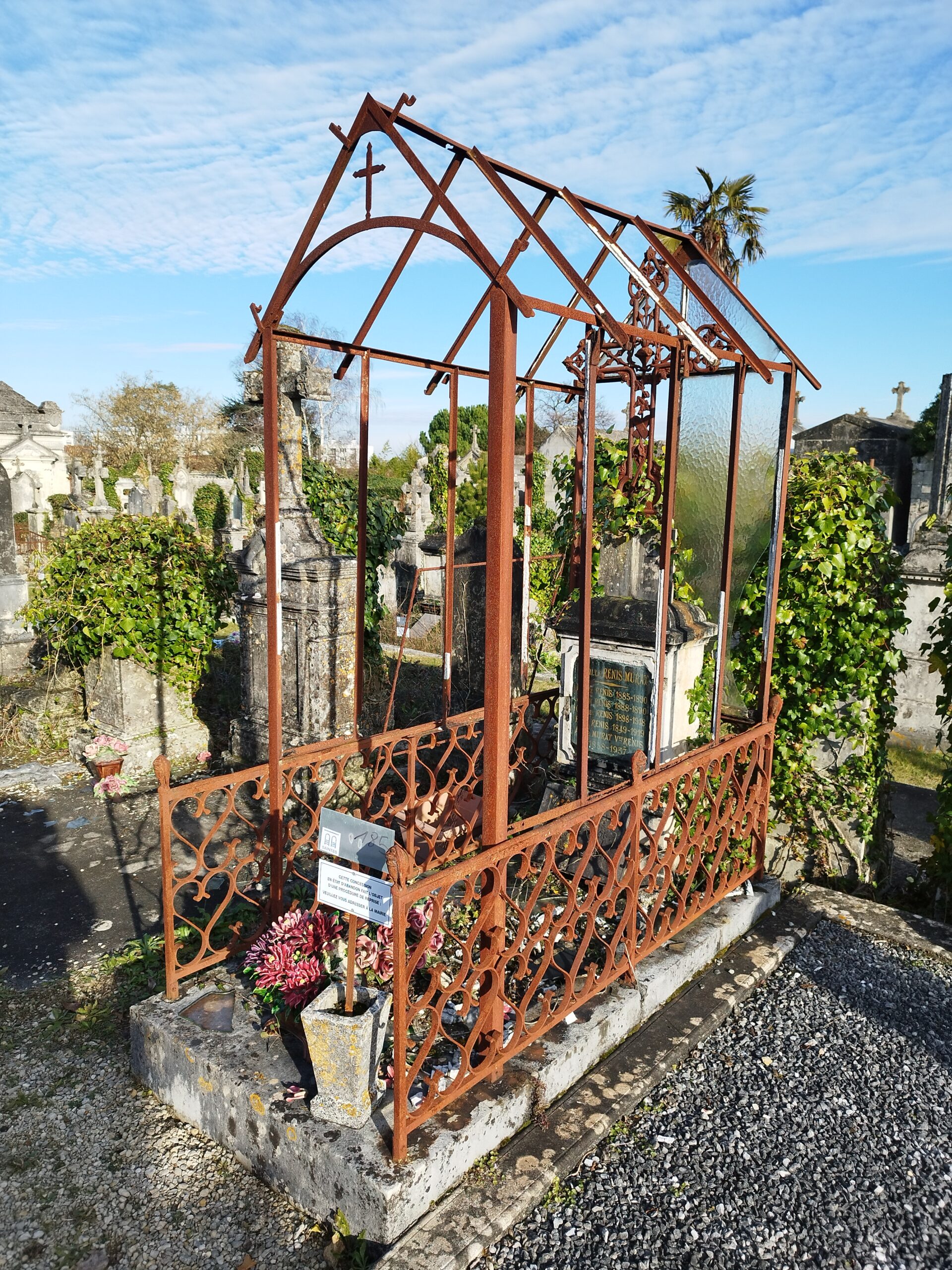 Cette sépulture est représentative de la mode de la fin du XIXème siècle. Des familles modestes souhaitent un écrin durable pour leur repos éternel sans avoir les moyens financiers de payer une chapelle en pierre de taille. La démocratisation du métal (matériau travaillé par M. Renis) et du verre, permet alors à beaucoup de familles de protéger les tombes et venir s’y recueillir à l’abri des intempéries.